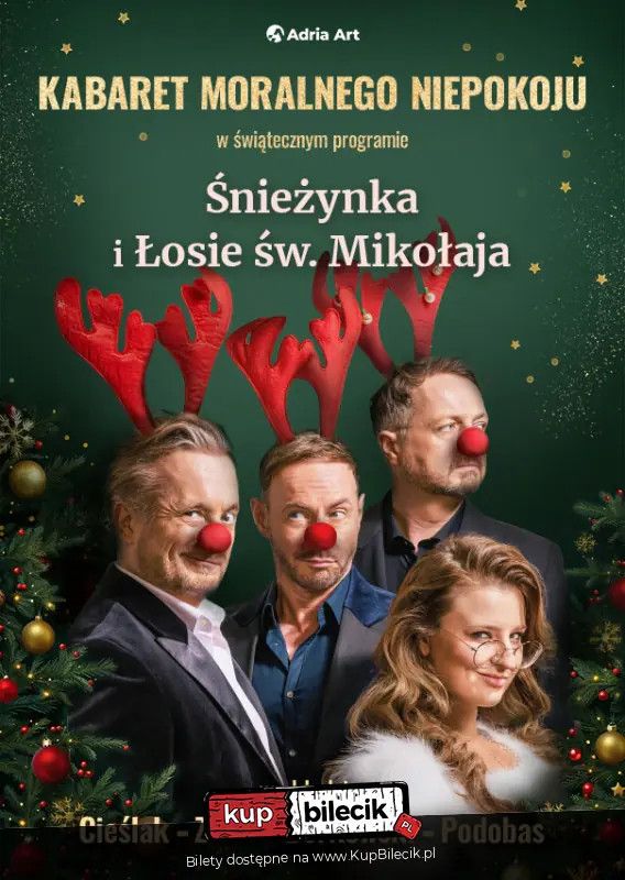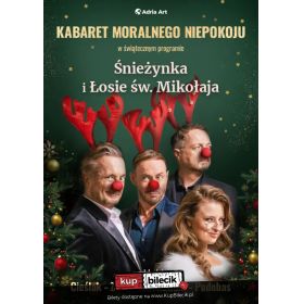 bilety: Świąteczna odsłona Kabaretu Moralnego Niepokoju wraca w zupełnie nowym wydaniu! "Śnieżynka i Łosie św. Mikołaja" to wieczór pełen ciepłego, grudniowego klimatu - tam, gdzie zapach piernika spotyka się z salwami śmiechu, a kultowe numery zyskują wyjątkową, świąteczną oprawę. Kabaret Moralnego Niepokoju artyści: Robert Górski, Przemysław Borkowski, Mikołaj Cieślak, Rafał Zbieć, Magdalena Stużyńska-BrauerKMN to jeden z najpopularniejszych w Polsce kabaretów. Zdobył on dużą popularność dzięki częstym występom w telewizji oraz błyskotliwym tekstom Roberta Górskiego. W emitowanym w latach 2003-2006 w TVP2 autorskim programie satyrycznym grupy pt. Tygodnik Moralnego Niepokoju co tydzień prezentowane były premierowe skecze. Kabaret skupia się głównie na sprawach społecznych, absurdach życia codziennego oraz nie stroni od polityki. Na przełomie 2007 i 2008 roku kabaret tworzył program pt. Miesięcznik Moralnego Niepokoju. Corocznie jest gospodarzem Kabaretowej Nocy Listopadowej. Bilety do nabycia na: KupBilecik.pl |