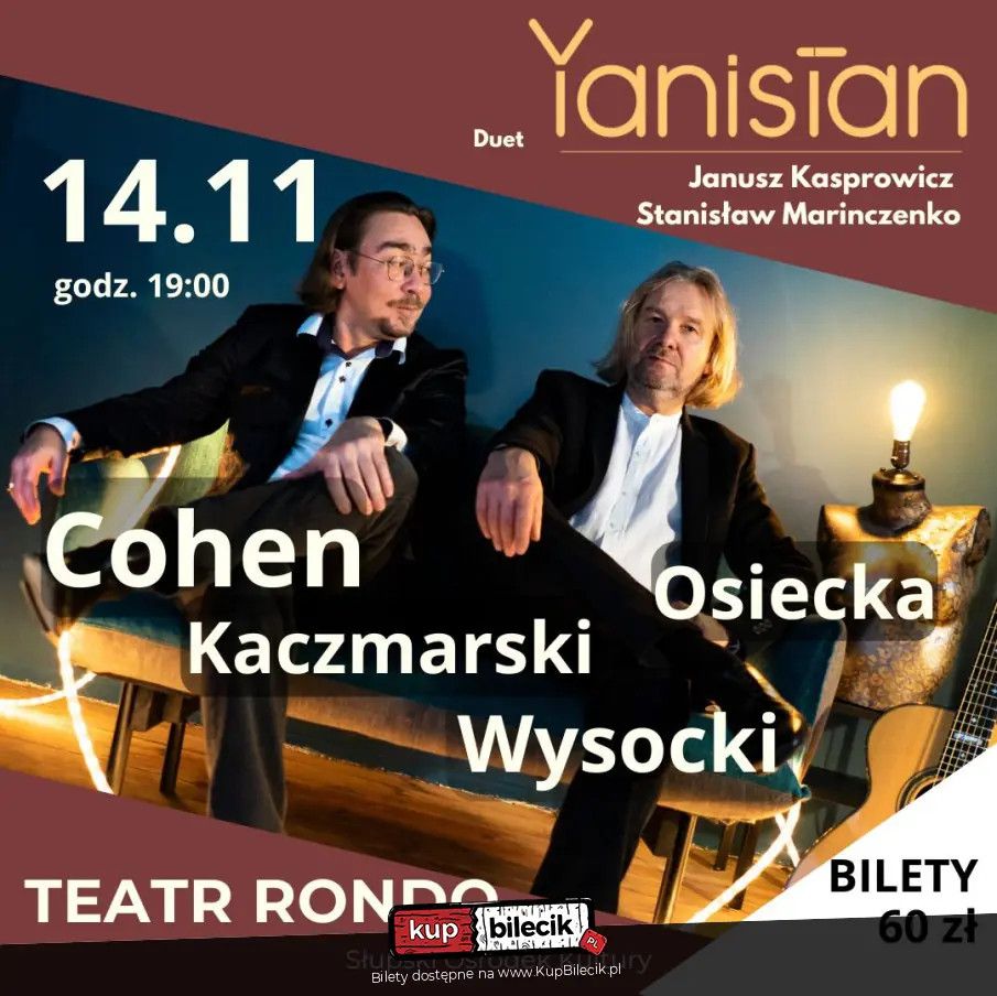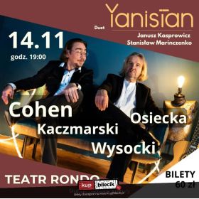 bilety: Koncert duetu YANISTAN. Piosenki ulubionych bardów. Wieczór z muzyką, która porusza serca i zostaje w pamięci na długo. Duet YANISTAN zabierze Państwa w podróż przez najpiękniejsze pieśni Włodzimierza Wysockiego, Leonarda Cohena, Agnieszki Osieckiej i Jacka Kaczmarskiego - artystów, którzy potrafili jednym słowem i dźwiękiem opowiedzieć o miłości, tęsknocie, wolności i codzienności. To nie będzie zwykły koncert, ale pełen emocji, klimatyczny wieczór, w którym znajdziecie zarówno refleksję, jak i wzruszenie. Nie przegap okazji, by usłyszeć te utwory w pięknych, akustycznych aranżacjach na żywo! Yanistan artyści: Janusz Kasprowicz i Stanisław MarinczenkoW programie koncertowym utwory Włodzimierza Wysockiego, Jacka Kaczmarskiego, Leonarda Cohena oraz kompozycje własne napisane do wierszy m.in. Andrzeja Bursy, Jana Kasprowicza oraz własnych tekstów, które ukażą się na nowej płycie Yanistan już w lutym 2020. Koncert duetu odbiega od stylistyki typowej dla występu bardów. Bogate instrumentarium, t.j. akordeon, buzuki, mandolina i oczywiście gitary, zmienianie przez wykonawców podczas koncertu, niebywale urozmaica brzmienie, które eliminuje monotonność występu, zwłaszcza podczas wirtuozerskich popisów multiinstrumentalisty. Bilety do nabycia na: KupBilecik.pl |